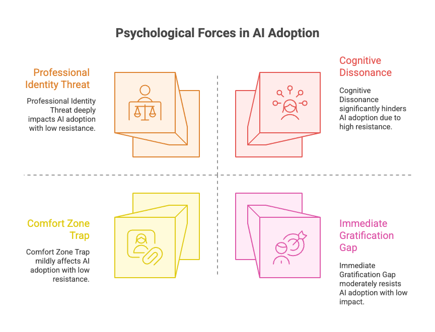 I've identified four psychological forces that create what I call "The AI Adoption Dilemma" through my work with law firms. The dilemma is where the people who could benefit most from AI are often the most resistant to using it.