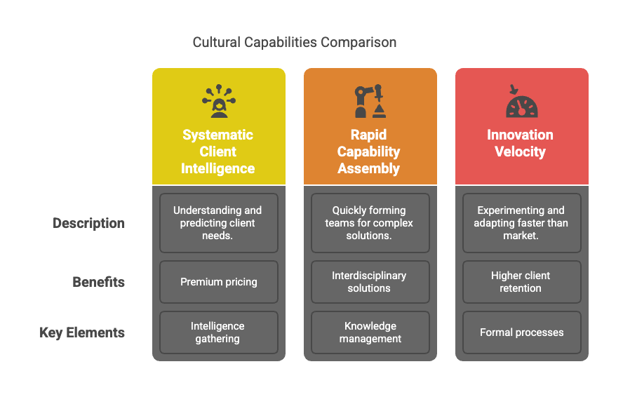 The firms that thrive in this environment share one advantage: organizational culture that systematically converts institutional knowledge into competitive differentiation.